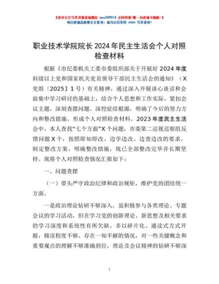 / 职业技术学院院长2024年民主生活会个人对照检查材料