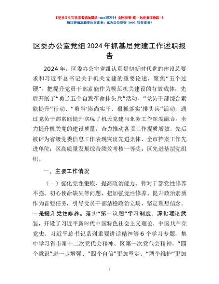 / 区委办公室党组2024年抓基层党建工作述职报告