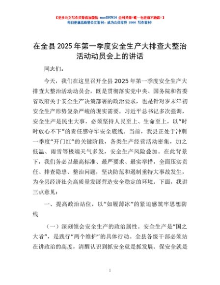 / 在全县2025年第一季度安全生产大排查大整治活动动员会上的讲话