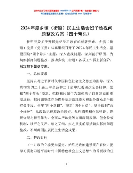 / 2024年度乡镇(街道)民主生活会班子检视问题整改方案(四个带头)