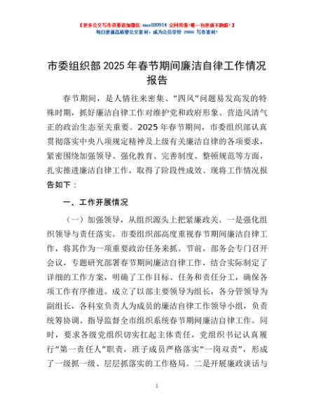 / 市委组织部2025年春节期间廉洁自律工作情况报告