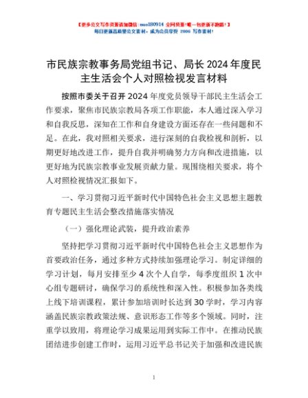 / 市民族宗教事务局党组书记、局长2024年度民主生活会个人对照检视发言材料