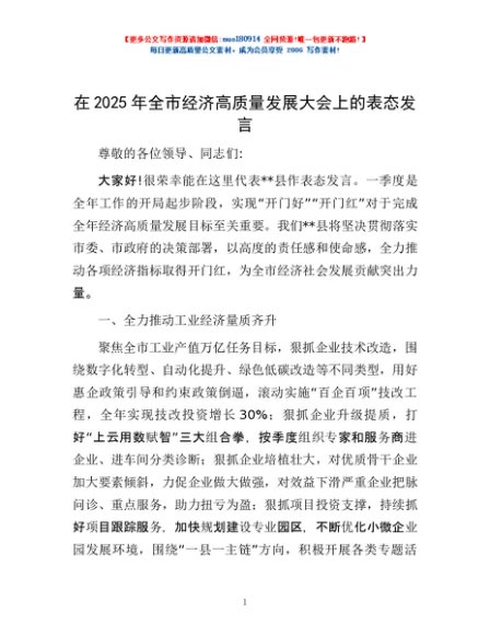 / 在2025年全市经济高质量发展大会上的表态发言