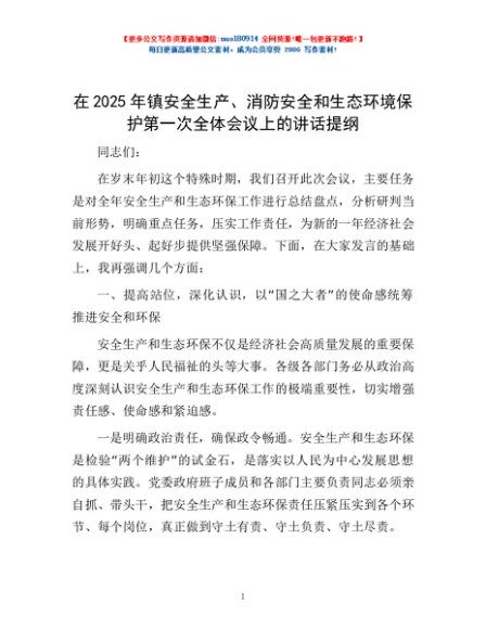 / 在2025年镇安全生产、消防安全和生态环境保护第一次全体会议上的讲话提纲