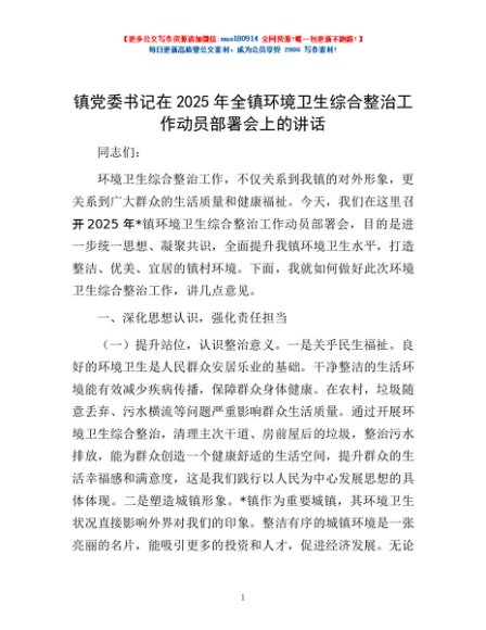 / 镇党委书记在2025年全镇环境卫生综合整治工作动员部署会上的讲话