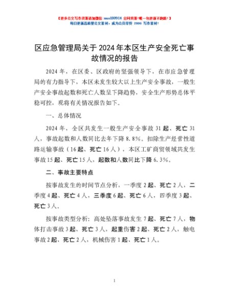 / 区应急管理局关于2024年本区生产安全死亡事故情况的报告