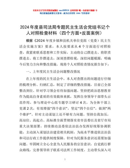 / 2024年度县司法局专题民主生活会党组书记个人对照检查材料(四个方面+反面案例)