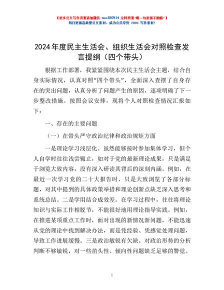 / 2024年度民主生活会、组织生活会对照检查发言提纲(四个带头)