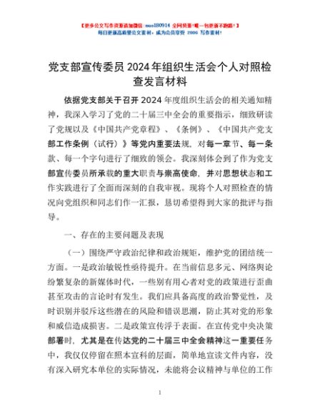 / 党支部宣传委员2024年组织生活会个人对照检查发言材料