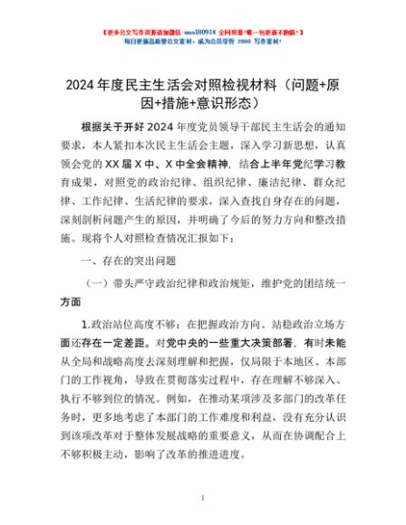 / 2024年度民主生活会对照检视材料 (问题+原因+措施+意识形态)