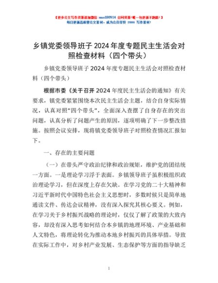 / 乡镇党委领导班子2024年度专题民主生活会对照检查材料(四个带头)