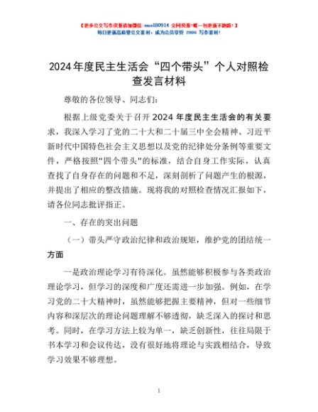 / 2024年度民主生活会“四个带头”个人对照检查发言材料