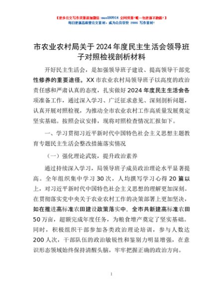/ 市农业农村局关于2024年度民主生活会领导班子对照检视剖析材料
