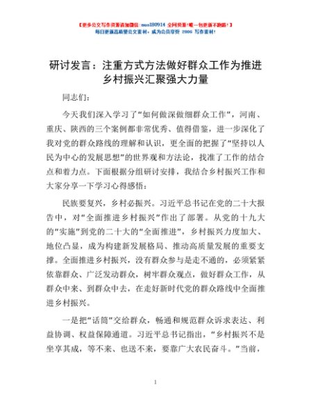 / 研讨发言:注重方式方法 做好群众工作 为推进乡村振兴汇聚强大力量