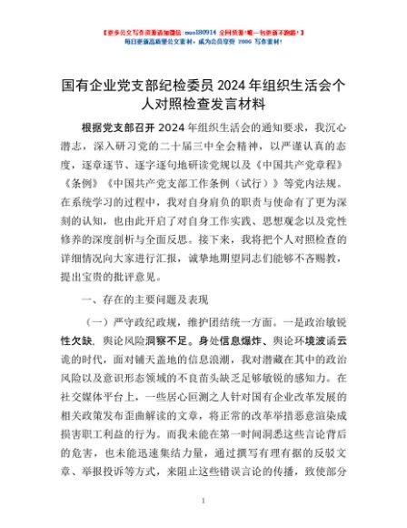 / 国有企业党支部纪检委员2024年组织生活会个人对照检查发言材料