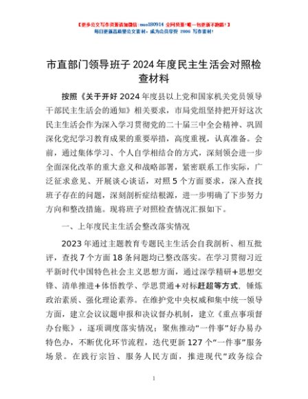 / 市直部门领导班子2024年度民主生活会对照检查材料