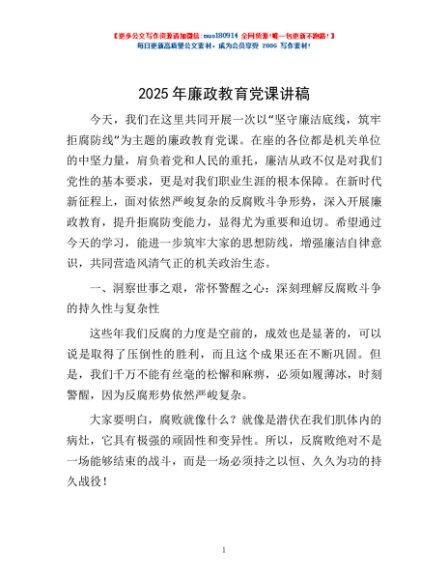 / 2025年廉政教育党课讲稿