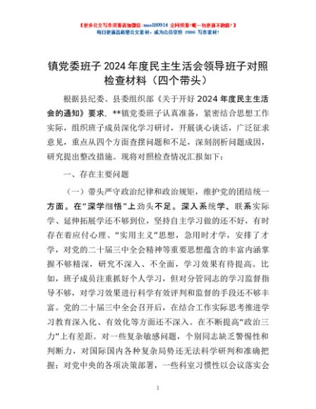 / 镇党委班子2024年度民主生活会领导班子对照检查材料(四个带头)