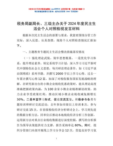 / 税务局副局长、三级主办关于2024年度民主生活会个人对照检视发言材料