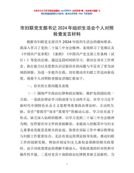 / 市妇联党支部书记2024年组织生活会个人对照检查发言材料