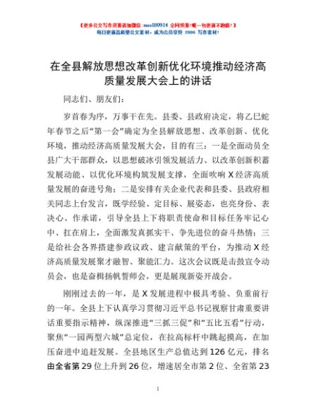 / 在全县解放思想改革创新优化环境推动经济高质量发展大会上的讲话