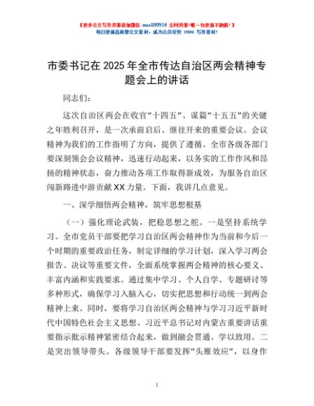 / 市委书记在2025年全市传达自治区两会精神专题会上的讲话
