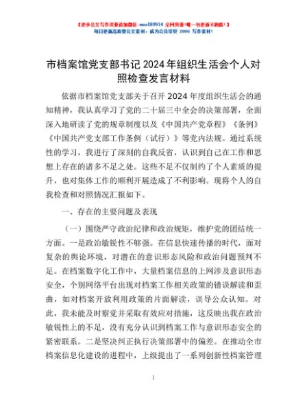 / 市档案馆党支部书记2024年组织生活会个人对照检查发言材料