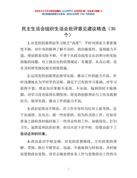 / 民主生活会组织生活会批评意见建议精选(30个)