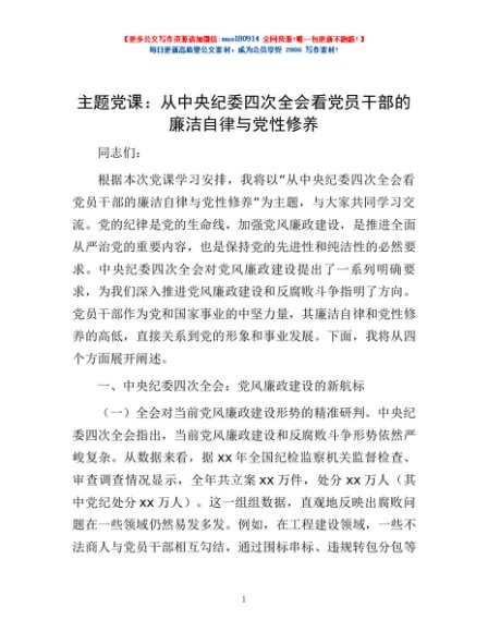 / 主题党课:从中央纪委四次全会看党员干部的廉洁自律与党性修养