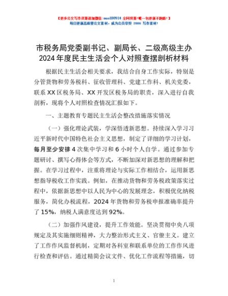 / 市税务局党委副书记、副局长、二级高级主办2024年度民主生活会个人对照查摆剖析材料