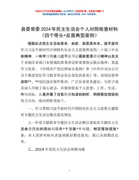 / 县委常委2024年民主生活会个人对照检查材料(四个带头+反面典型案例)