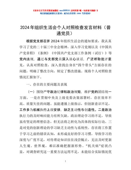 / 2024年组织生活会个人对照检查发言材料(普通党员)