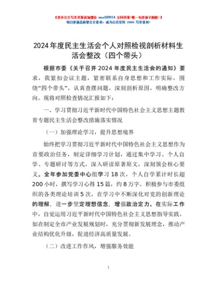 / 2024年度民主生活会个人对照检视剖析材料生活会整改(四个带头)