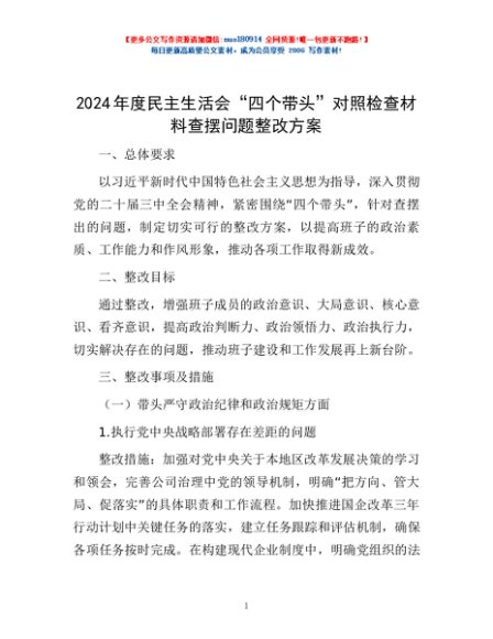 / 2024年度民主生活会“四个带头”对照检查材料查摆问题整改方案