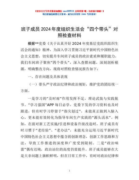 / 班子成员2024年度组织生活会“四个带头”对照检查材料