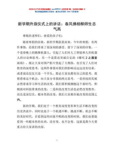 / 新学期升旗仪式上的讲话:春风拂杨柳 师生志气高