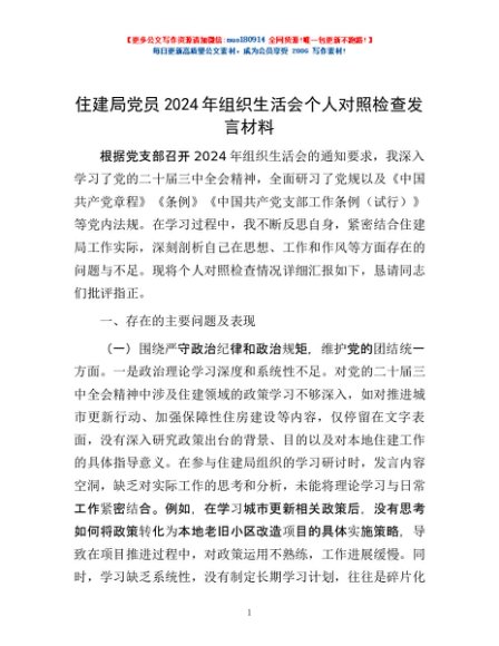 / 住建局党员2024年组织生活会个人对照检查发言材料