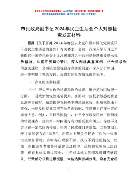/ 市民政局副书记2024年民主生活会个人对照检查发言材料