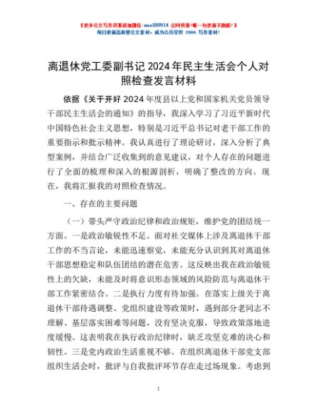 / 离退休党工委副书记2024年民主生活会个人对照检查发言材料