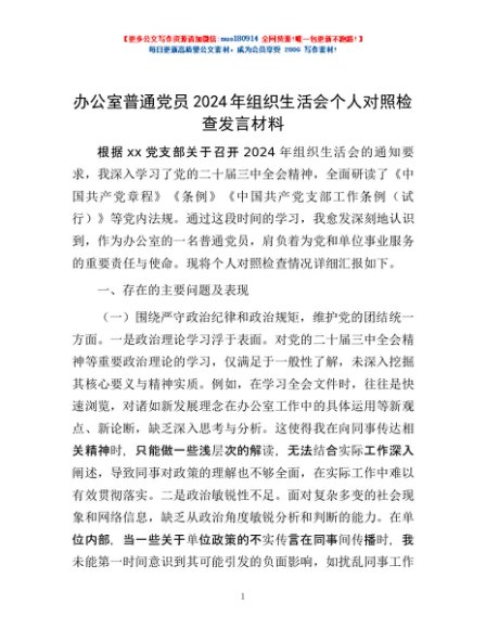 / 办公室普通党员2024年组织生活会个人对照检查发言材料