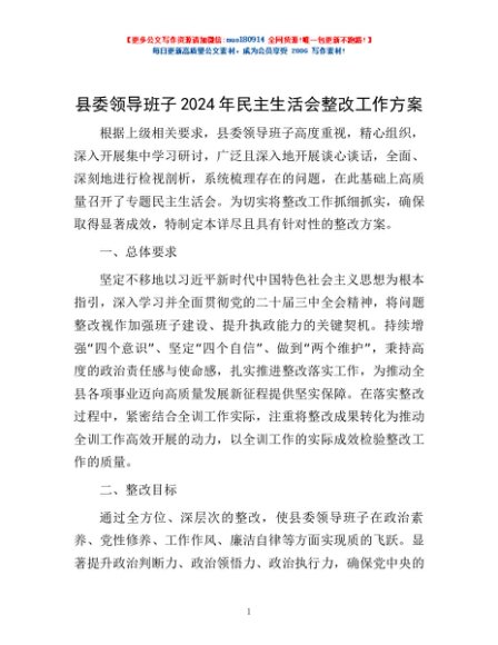 / 县委领导班子2024年民主生活会整改工作方案