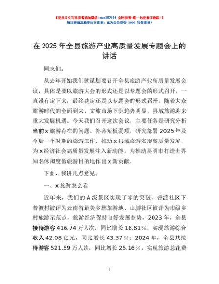 / 在2025年全县旅游产业高质量发展专题会上的讲话