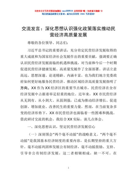 / 交流发言:深化思想认识 强化政策落实 推动民营经济高质量发展