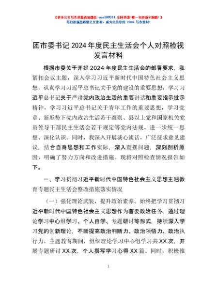 / 团市委书记2024年度民主生活会个人对照检视发言材料