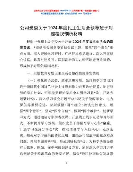 / 公司党委关于2024年度民主生活会领导班子对照检视剖析材料