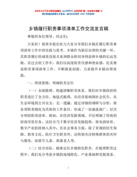 / 乡镇履行职责事项清单工作交流发言稿