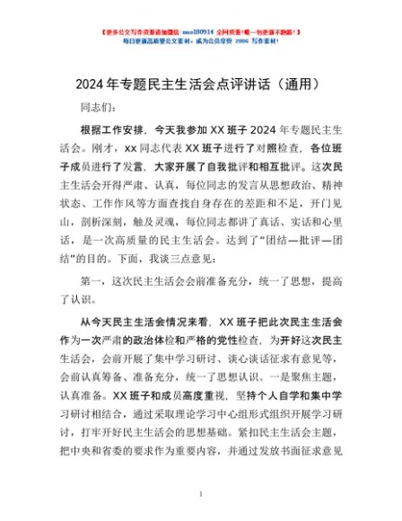 / 2024年专题民主生活会点评讲话(通用)