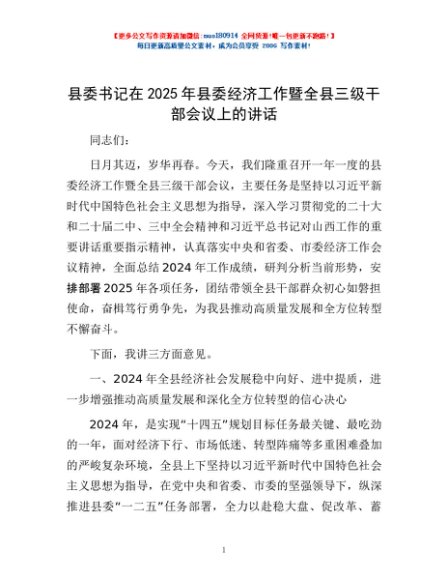 / 县委书记在2025年县委经济工作暨全县三级干部会议上的讲话
