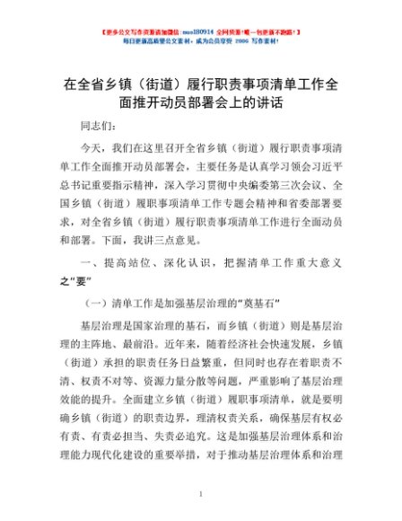 / 在全省乡镇(街道)履行职责事项清单工作全面推开动员部署会上的讲话