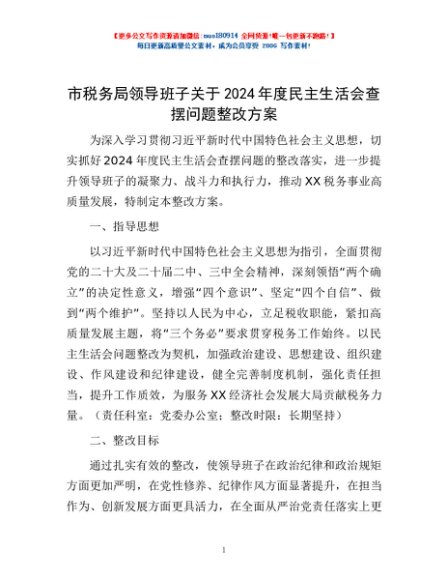 / 市税务局领导班子关于2024年度民主生活会查摆问题整改方案